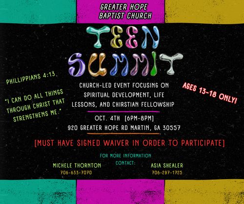 Join us for an exciting of empowerment, fellowship, and fun at Greater Hope Baptist Church! Teen Summit is designed to inspire, and equip youth to grow in faith, leadership, and community.